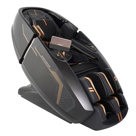 Unlike massage chairs with a cumbersome legrest unit that feels detached from the rest of the chair. the Supreme Hybrid's form factor wraps all parts into a unified. pleasing rounded body.