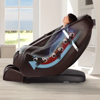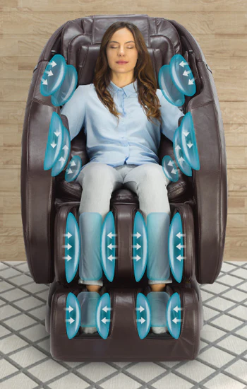 TheMajestyuses advanced technology and therapeutic features to deliverunsurpassed full-body massage therapy.It features aroomy interior to fit many body types. Built into the chair are42 Airbagsthat rhythmically inflate and deflate during your massage session. These airbags gently stretch muscles to melt tension. improve circulation. and ease body fatigue. Airbags are located on the shoulders. around the arms. around the hips and even under the thighs and calves in order to apply a full-body stretch.