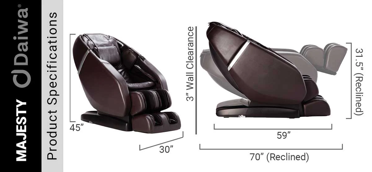 Good health is the ultimate luxury. The Daiwa Majesty massage chair gives you the royal treatment. offering whole-body wellness based on advanced engineering. The Majesty uses therapeutic features to deliver thorough full-body massage. heat. and zero-gravity therapies.