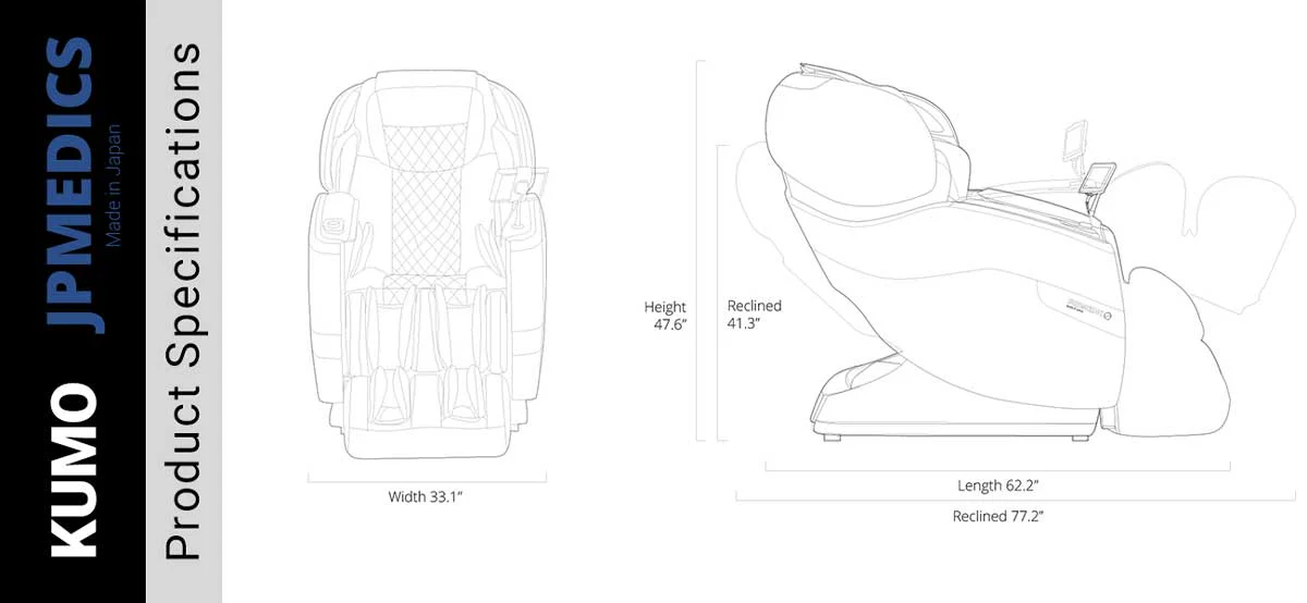 Unlike most Japanese massage chairs. The Kumo also features Zero Gravity Recline and Reflexology Foot Rollers. Combined with expertly choreographed massage programming. heated knee therapy. and touchscreen tablet design for easy access to massage functions and adjustments.