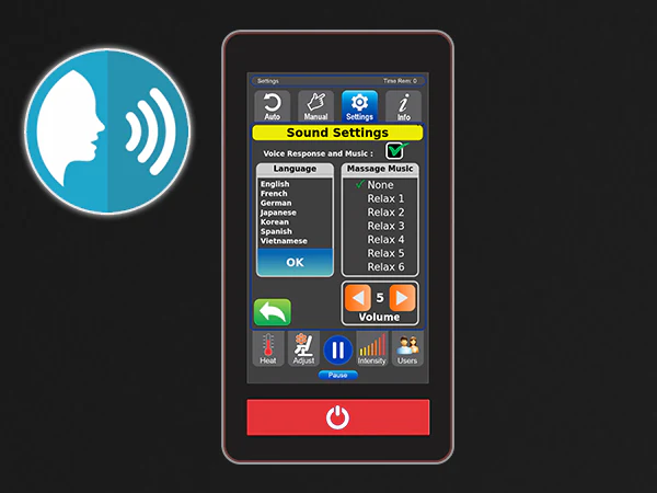 • 7 HUMAN-VOICE RESPONSE System (English. Vietnamese. Spanish. German. French. Japanese. and Korean). This chair gives instructions and confirms the commands you give it!