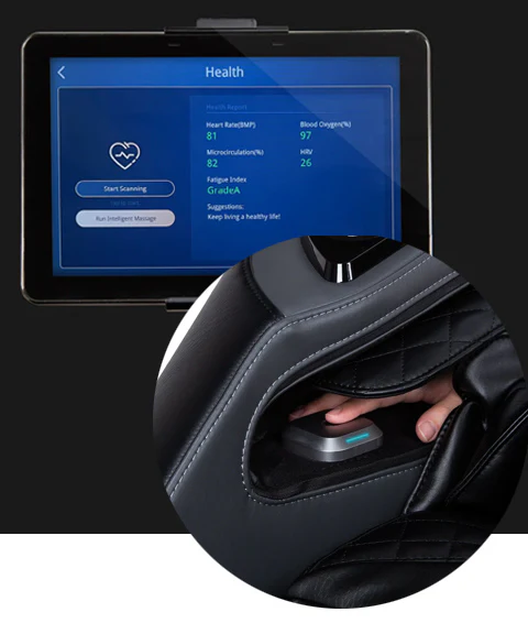 The Osaki Ai Vivo 4D+2D massage chair has advanced capabilities with its built-in health monitor. By detecting various metrics such as heart rate. blood oxygen levels. microcirculation. and fatigue index. the chair's Ai technology can provide a personalized massage experience tailored to your body's current condition.